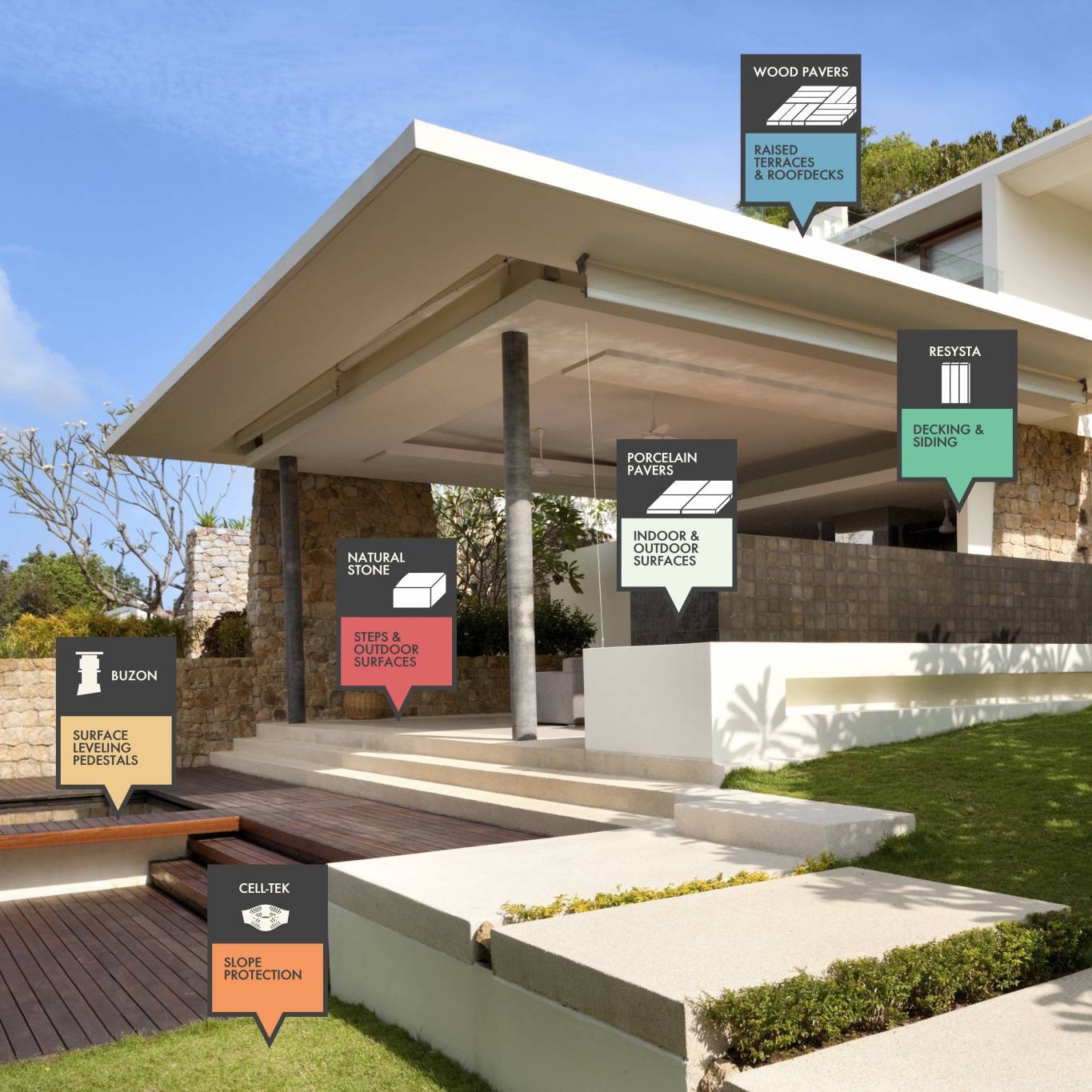 Whether you are creating a stable and level base for a terrace or elevated deck, sourcing distinctive stone for cladding, stairs, and structures, or designing a next-generation commercial space within innovative composite rainscreens, HDG has your stone, pavers, and pedestal material needs covered. We source superior products so you can deliver your best work. Choose standard or custom solutions from the world’s leading suppliers of natural stone, wood siding and decking, Resysta rice hull composite, structural porcelain pavers, Buzon screwjack pedestals, and Cell-Tek slope protection products.